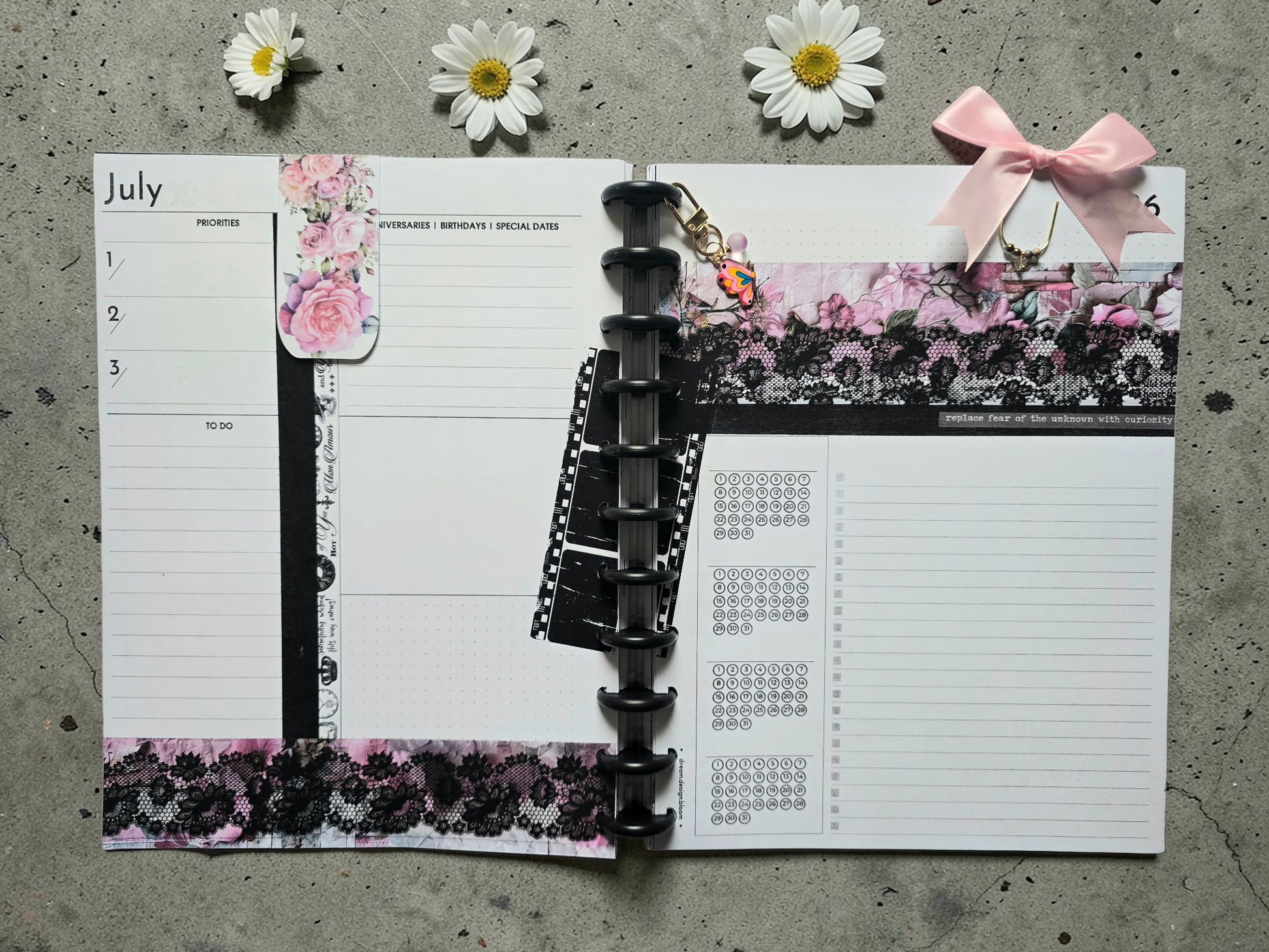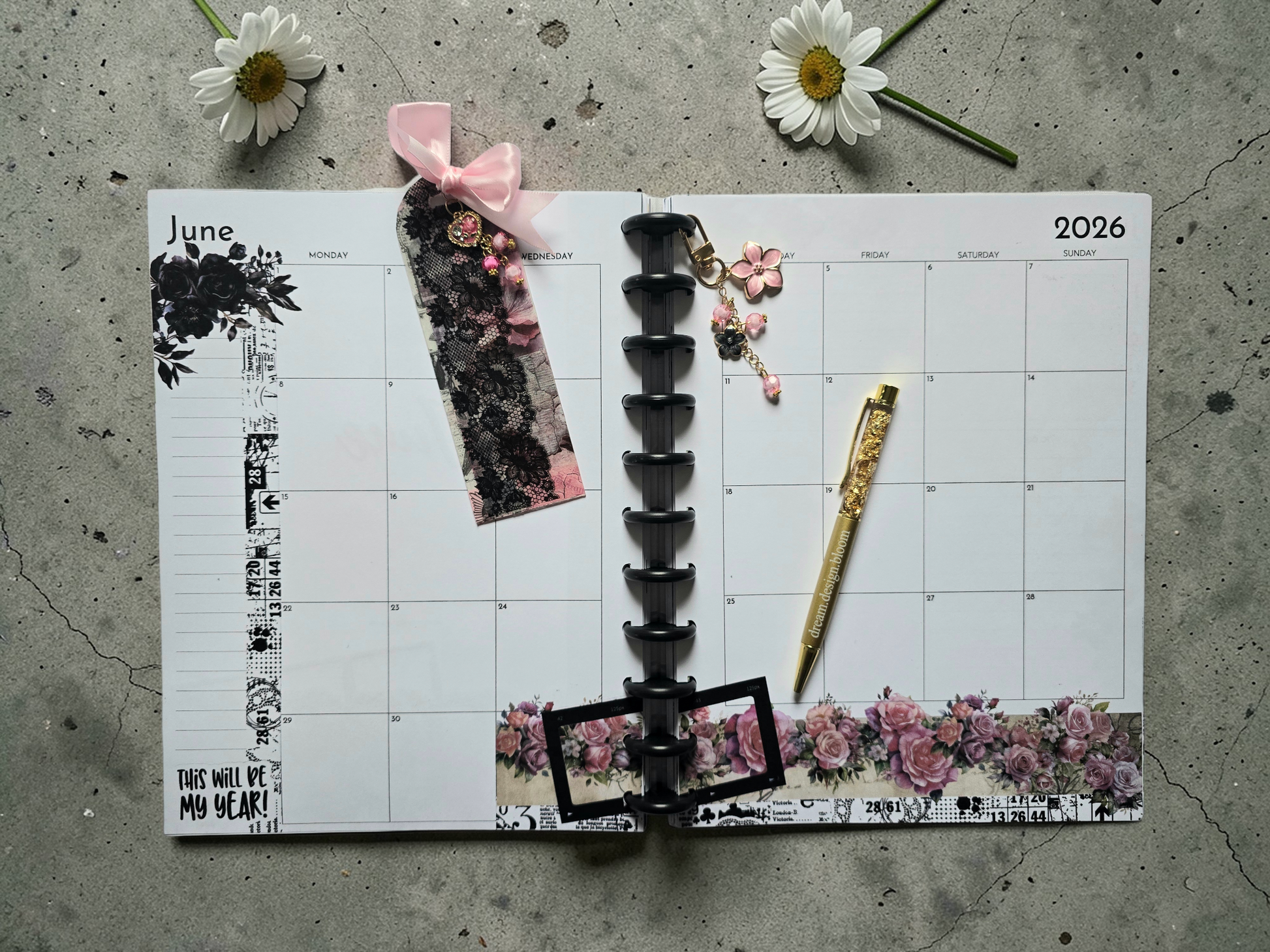 The dream.design.bloom Disc Charm adds a small decorative accent to your discbound planner, creating a moment of elegance that moves with you beyond the page.